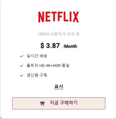 GGoingbus의 공유 멤버십 서비스를 이용하면 매달 4,820원만으로 Netflix의 모든 프리미엄 기능을 누릴 수 있습니다. 여기에는 고화질 시청, 광고 없는 경험, 여러 개의 독립적인 사용자 계정 등이 포함됩니다. 공유 멤버십의 장점은 구독 비용을 다른 사용자들과 함께 분담하면서도, 각자의 시청 기록과 추천 콘텐츠가 독립적으로 관리되어 서로 방해받지 않는다는 점입니다. 이런 구독 방식은 경제적이면서도 높은 품질의 시청 경험을 보장해줍니다. 예산은 한정되어 있지만 좋은 드라마를 놓치고 싶지 않은 팬들에게는 정말 완벽한 선택이에요!